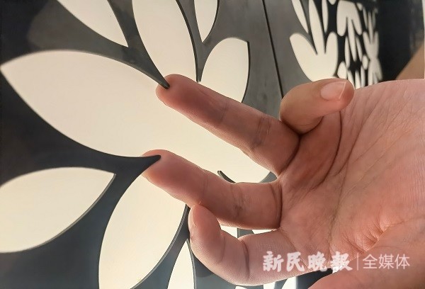 什么样的花能刺伤客人?记者前往现场发现,段先生等人所说的花,是贴在电梯玻璃上的花饰。花饰与玻璃一起如同电梯里的一个“吊柜”一样,虽然看上去标新立异,但一朵朵镂空的“花瓣”连接处,如同针一样尖锐,有的并没有紧贴着玻璃,而是向外翘起。翘起后,“针”尖与玻璃间可以插进一个公交卡套或半个手指。