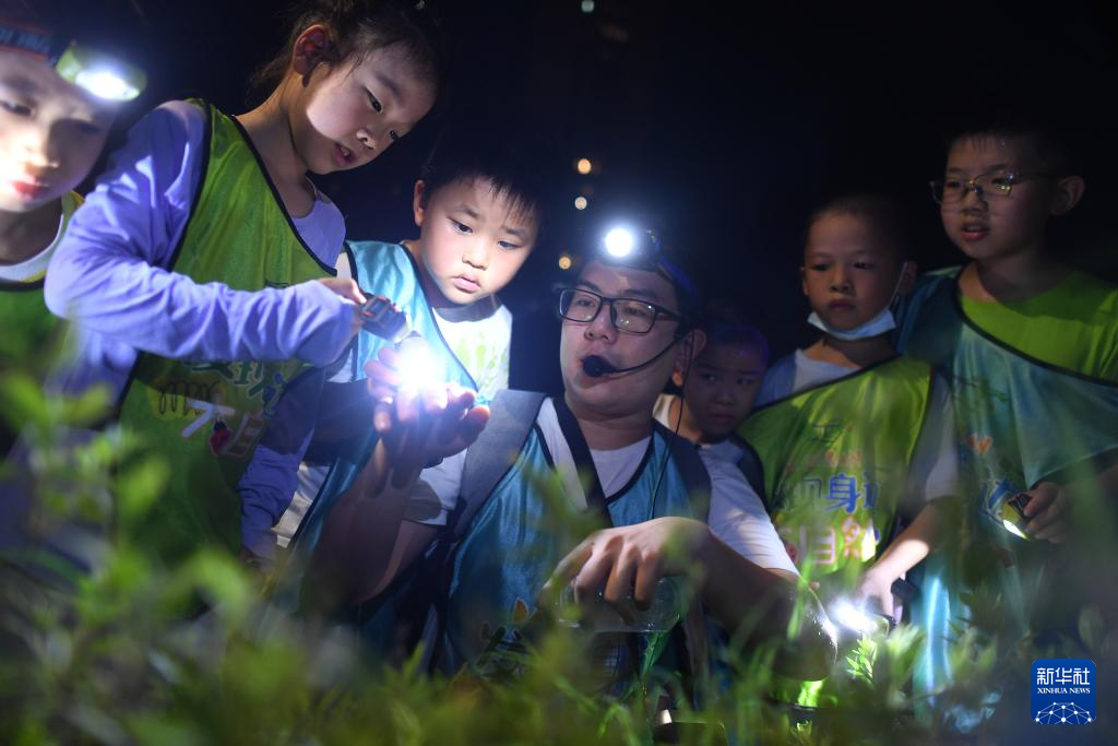 7月6日晚,在武汉市颐湖公园,孩子们在自然导师带领下夜观昆虫。