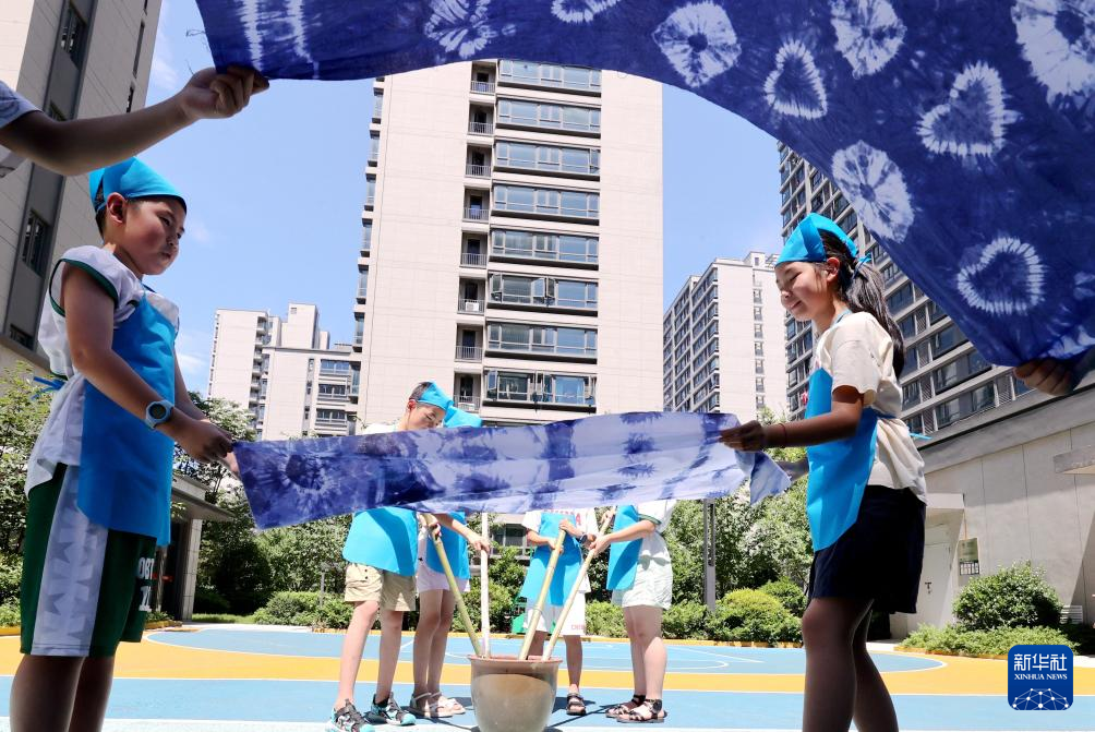 7月19日,在浙江省湖州市德清县阜溪街道板桥社区工会驿站,孩子们体验扎染技艺。