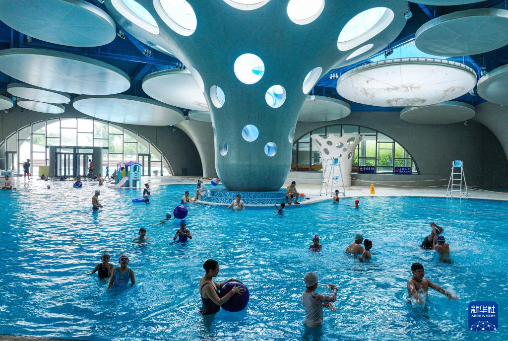 7月19日,在山东省荣成市少年宫游泳馆,孩子们在游泳池内玩水(无人机照片)。