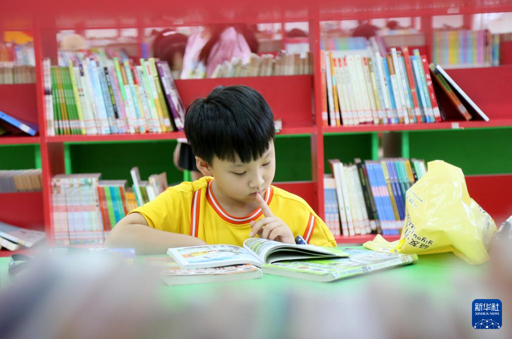 8月3日,在河南省洛阳市汝阳县图书馆少儿阅读室,小学生在阅读书籍。