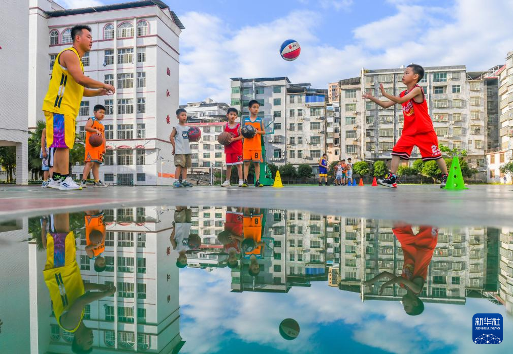 7月19日,在湖南省永州市道县树湘学校篮球训练营,孩子们参加篮球训练。
