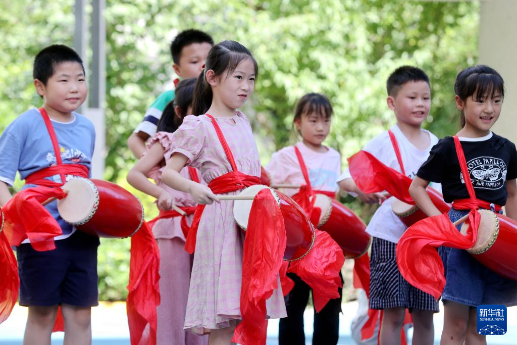 7月19日,在浙江省湖州市德清县阜溪街道板桥社区工会驿站,孩子们在练习打腰鼓。
