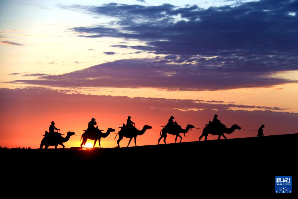6月27日清晨,游客在甘肃省敦煌市鸣沙山月牙泉景区游览。