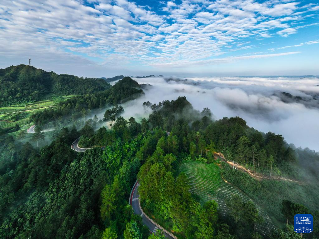 夏日,位于贵州省黔东南苗族侗族自治州施秉县的黑冲景区绿意盎然,远山、森林、公路在云海中若隐若现,犹如水墨画卷。