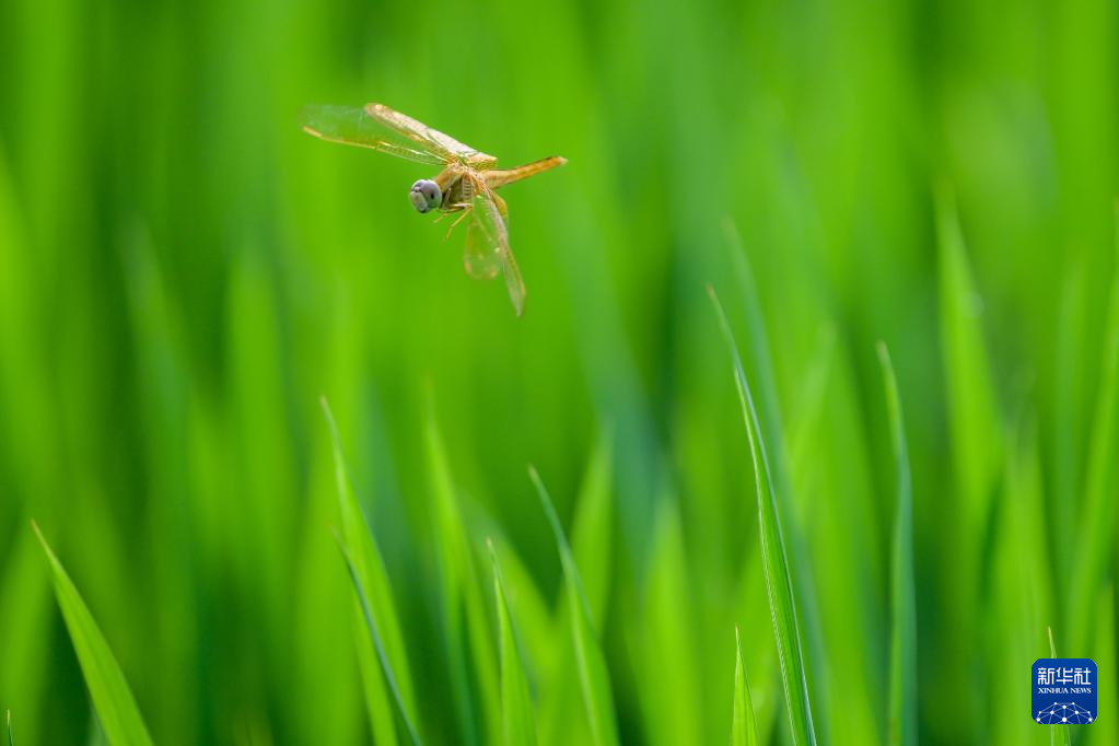7月31日,在江苏省昆山市巴城镇绰墩山村,一只蜻蜓飞过稻田。
