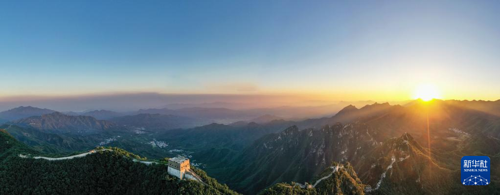 这是8月16日拍摄的夕阳下的箭扣长城(无人机全景照片)。