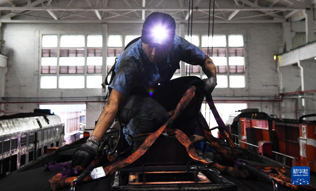 8月16日,广州机务段职工在机车车顶进行吊运作业。