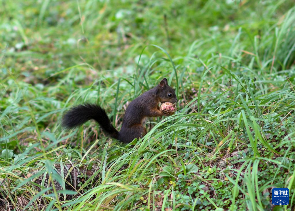 松鼠在林间觅食(8月11日摄)。