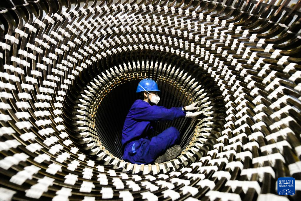 9月3日,在哈电集团哈尔滨电机厂有限责任公司的生产车间,工人在进行生产作业。
