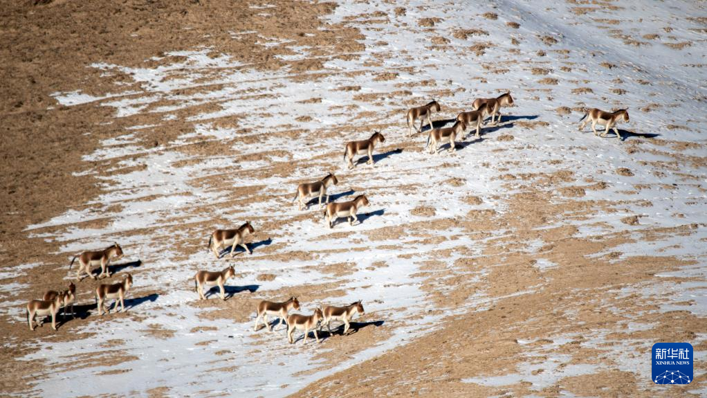 12月17日,藏野驴在哈尔腾高原上活动觅食。
