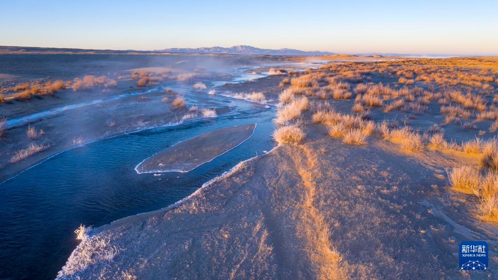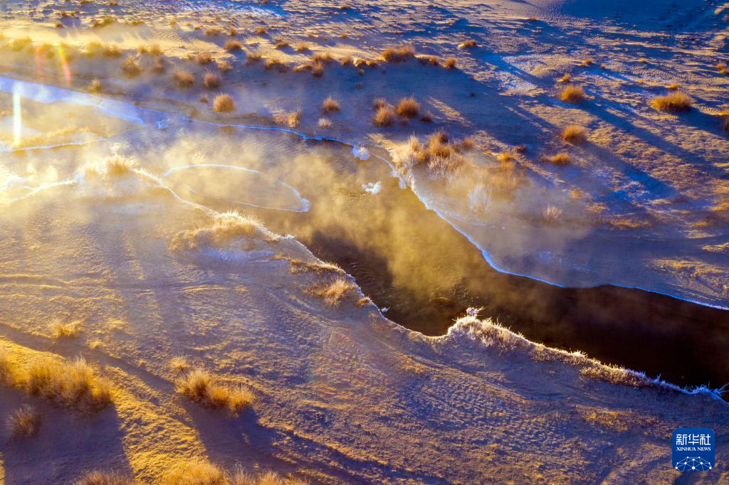 12月17日在哈尔腾高原上拍摄的晨光中的小哈尔腾河(无人机照片)。