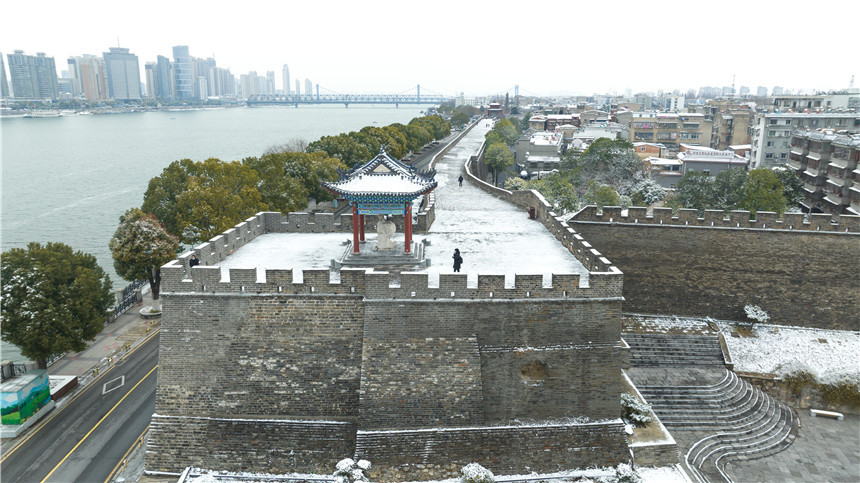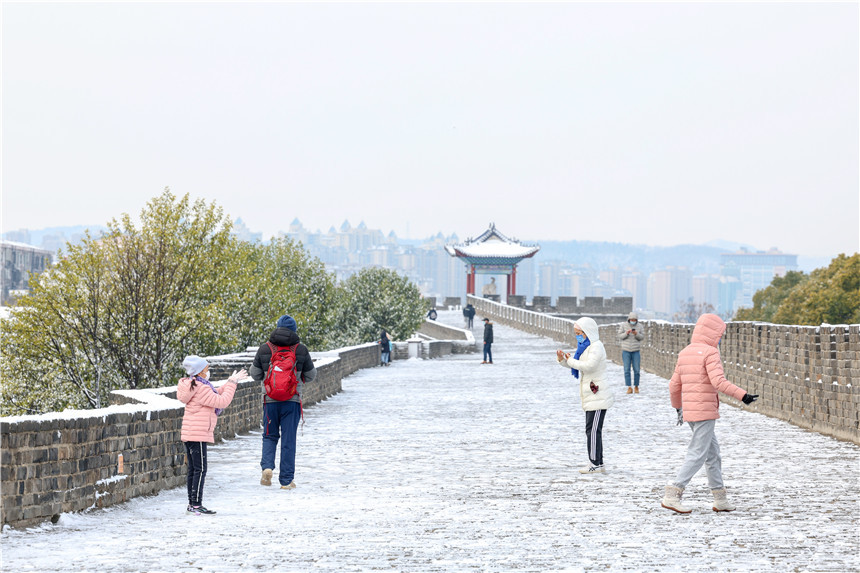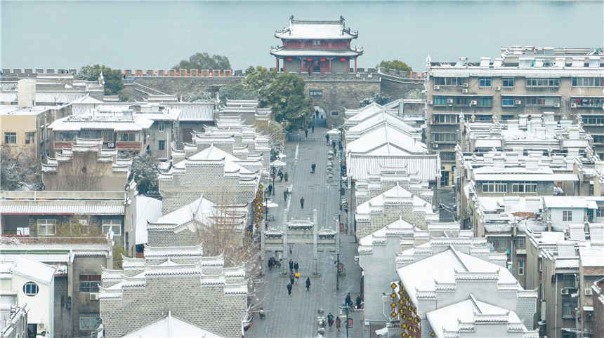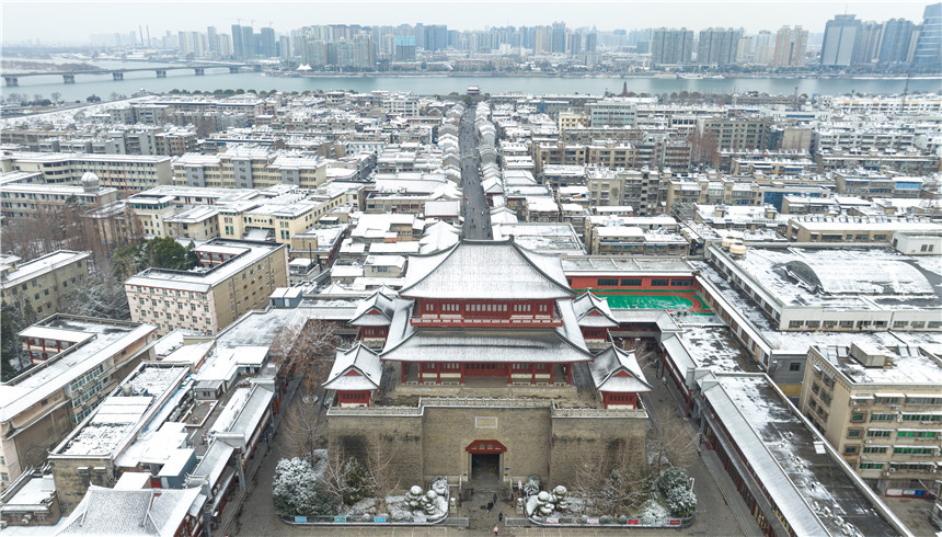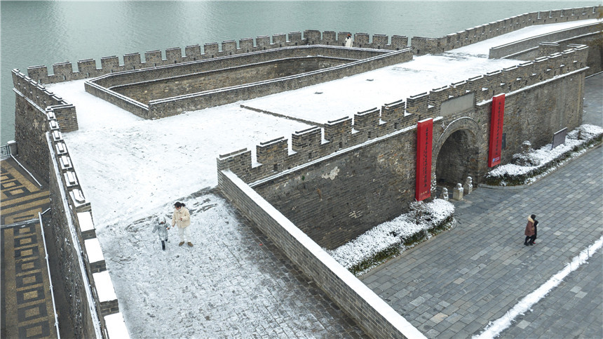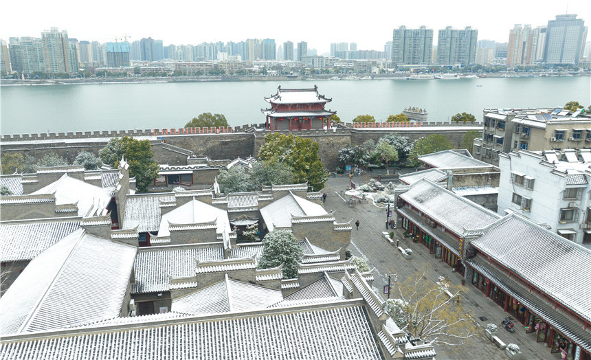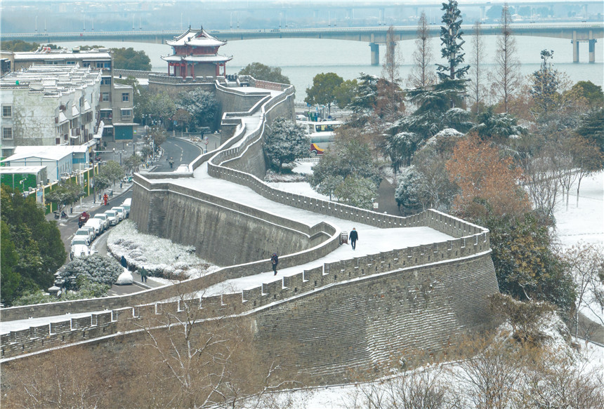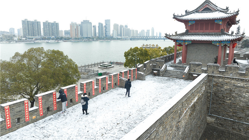 2023年1月15日,受冷空气影响,湖北襄阳古城迎来2023年的首场降雪,雪后的古城银装素裹,美景如画,吸引了众多市民到古城赏雪游玩。(杨东 摄影报道)