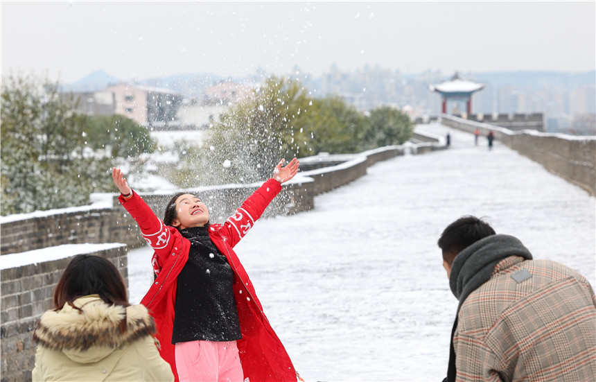 1月15日,市民在湖北省襄阳古城城墙上赏雪游玩。