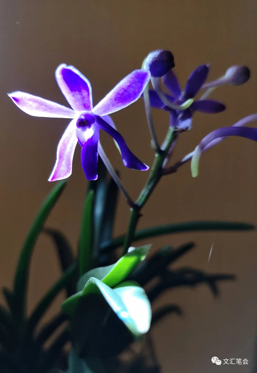 这棵风兰本来比较迷你,只有十四五公分高的样子,在叶腋间长出一根细细的花梗,上面有五六个绿豆芽似的小小的花苞,还是白色的。这风兰开花是紫色的,开花前花苞会变色。