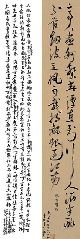我询问素子老师,唐湜那幅藏品何故先寄陈先生?她年事已高,没有回答这个问题,只谈及自藏沈从文书法的来历:“沈从文书法极佳,尤善章草,荒芜的书箧中即有不少沈从文送他的字幅,所写内容大多为自作诗,荒芜随手检赠给我们一个长条幅,我们很珍惜……沈从文夫人张兆和,是我们忘年交文字学家周有光夫人张允和的三妹,允和二姐也曾以沈从文诗幅赠予陈朗。”陈朗、素子伉俪珍藏的两幅沈作章草长条幅,一幅取自周有光家,落款为“张齐贤诗,沈从文习字,时八一年盛夏中,七十九岁”。此作与唐湜那幅沈作,写于同年,也有笔误,所谓“张齐贤诗”,其实是宋代郑文宝的《柳枝词》(上图右)。另一幅作品是陈朗后来从荒芜处获赠的,他非常珍惜。此幅作品未曾落款,正是素子老师所言的沈氏自作诗,名为“感事残稿”(上图左)。诗名前写“旧作”二字,因此作曾以“拟咏怀诗”为题刊于1980年4月的《花城》。但《感事残稿》与《花城》所刊略有文字出入,且有诗注,兹抄如下,以飨读者: