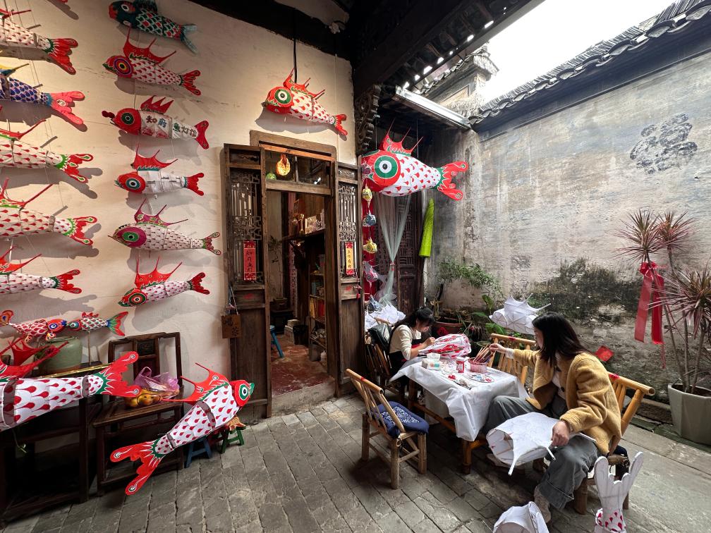 在歙县斗山街“鱼你有约”小店,几十平方米的店铺里“挤”满大小不一的鱼灯,店铺主理人潘敏正手把手教客人制作鱼灯,扎竹骨、糊彩纸、绘鳞纹……指尖起落间,朴素材料便有了鱼跃灯影的韵味。