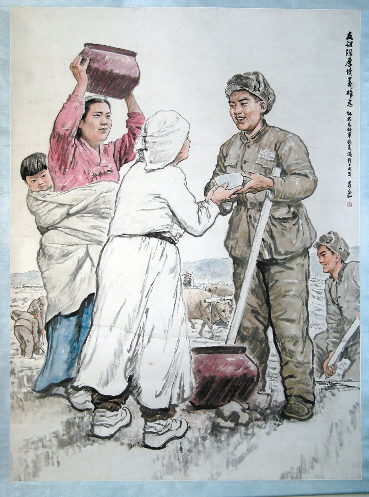 在展厅里,有一幅蒋兆和创作的中国画《友谊深厚情义难忘》,画中的“纪念志愿军抗美援朝十周年”题跋道出了其创作的时间。画面的主体是两位朝鲜妇女正为志愿军战士送水,其中一位妇女还背着可爱的幼儿。在几位主要人物的身后,画家细致地描绘了志愿军战士们在农田帮助朝鲜人民恢复农业生产的场景。在中朝军队打退以美国为首的“联合国军”、朝鲜停战协定签订后,志愿军在巩固防守的同时,还帮助朝鲜人民建设新家园,与朝鲜人民结下了深厚情谊。